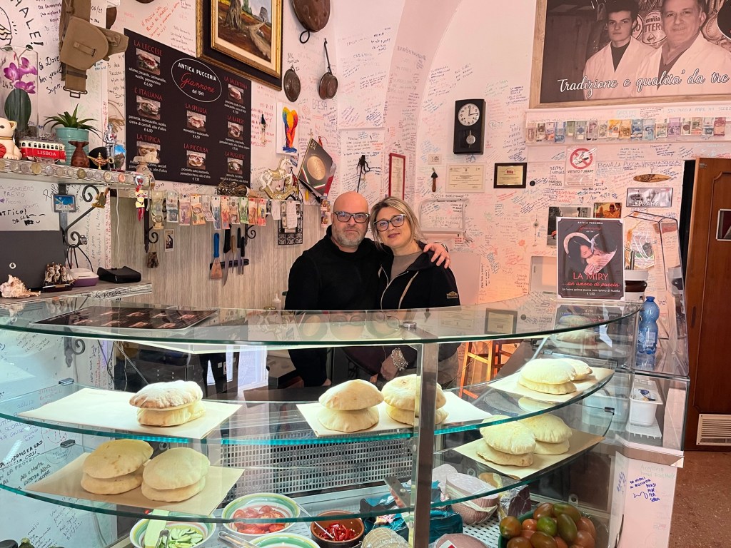 Cattedrale di Maria Santísima Assunta e Sant’OronzoPiazza del DuomoCappuccino time😉Roman amphitheater, under renovation. It once held 35,000 people in 200AD.Chiesa di Santa Chiara Wait, a pasticceria! It is Valentine’s Day…cannoli anyone? 😎Basilica di Santa CroceLunch time, panini shop owners.World War I memorial. Castello Carlo VPorta Napoli Arco di Prato built in 1440 to commemorate victory over the invaders from Turkey.Sunset over Lecce from our Patio!
